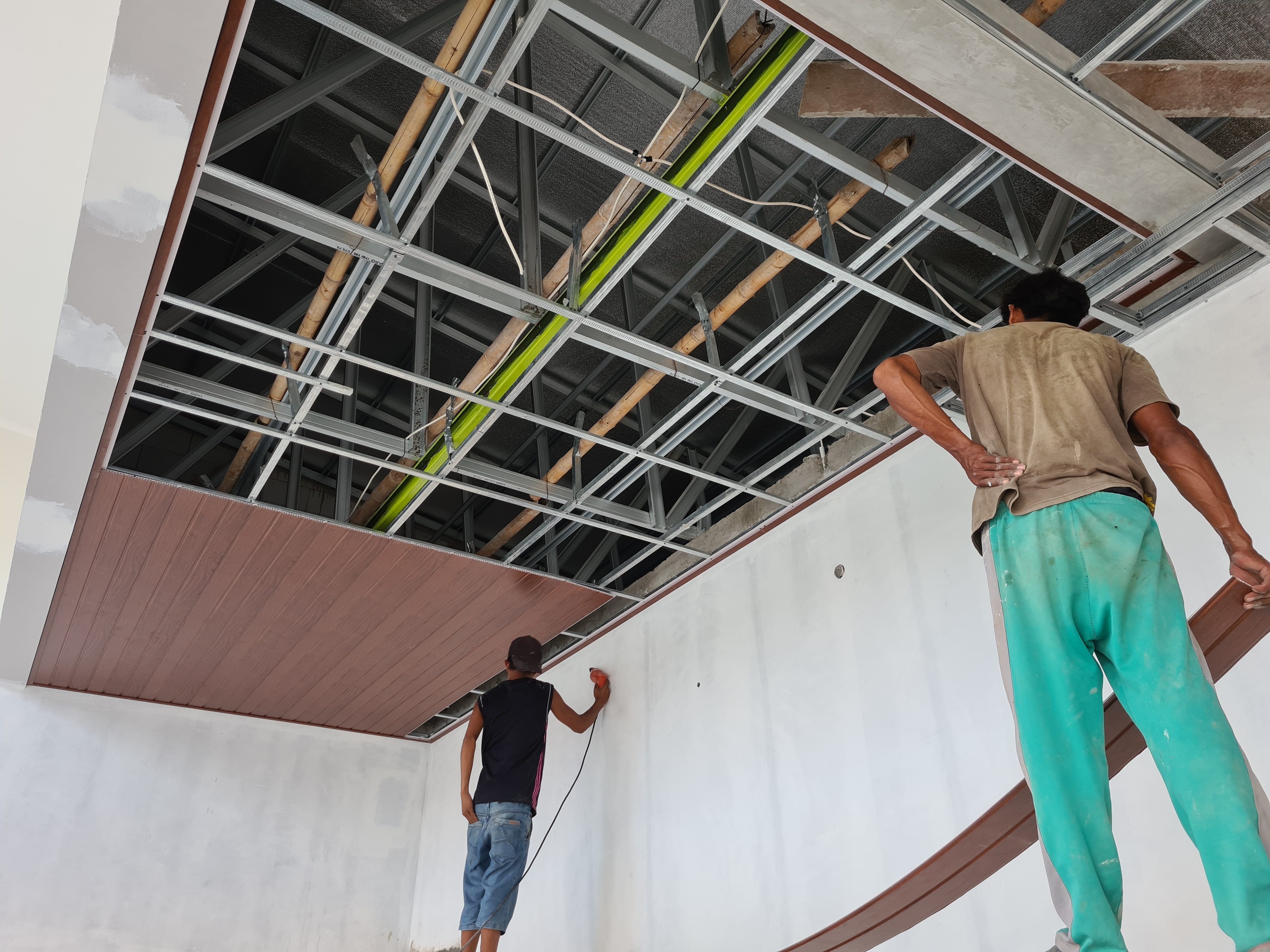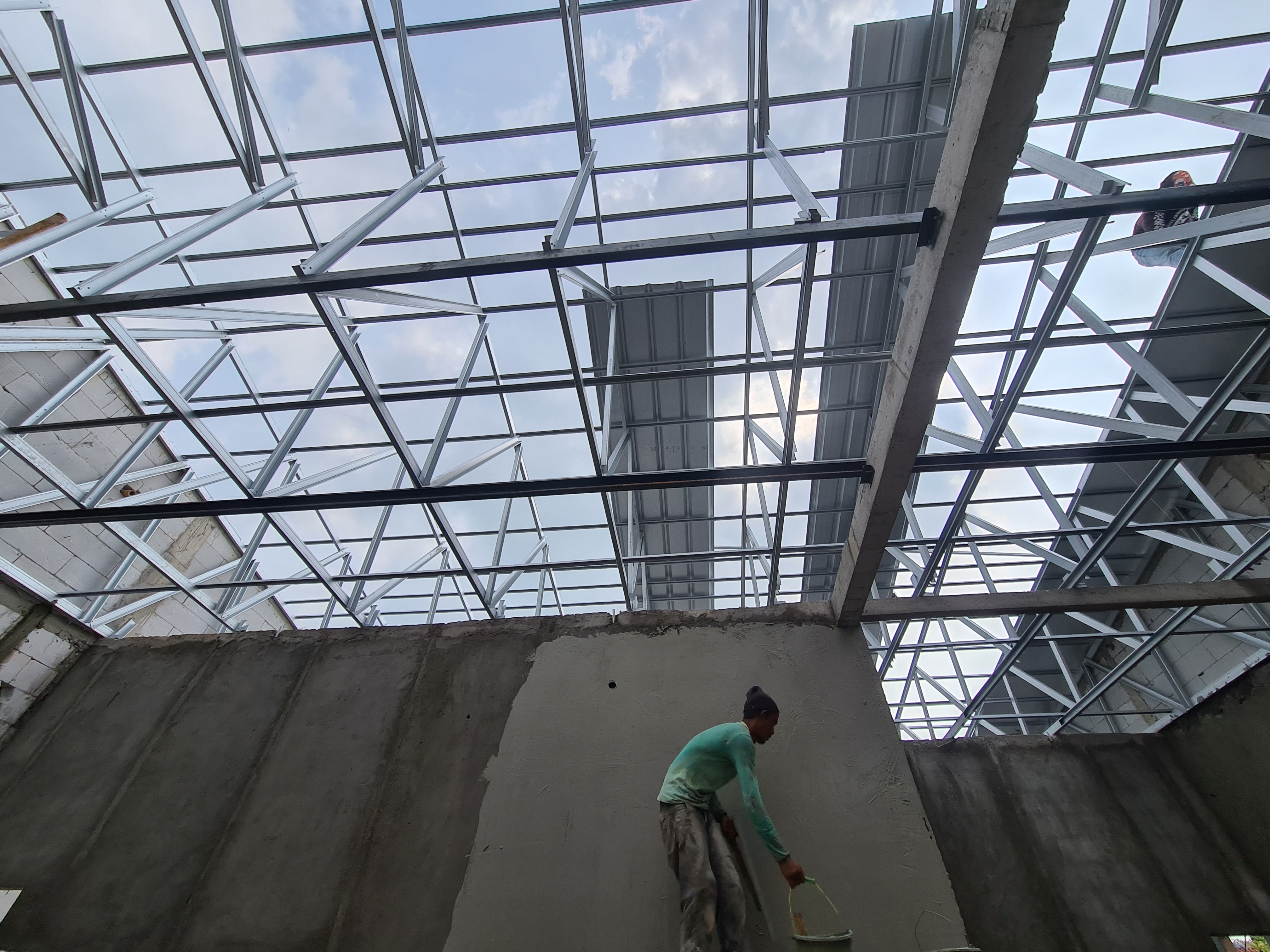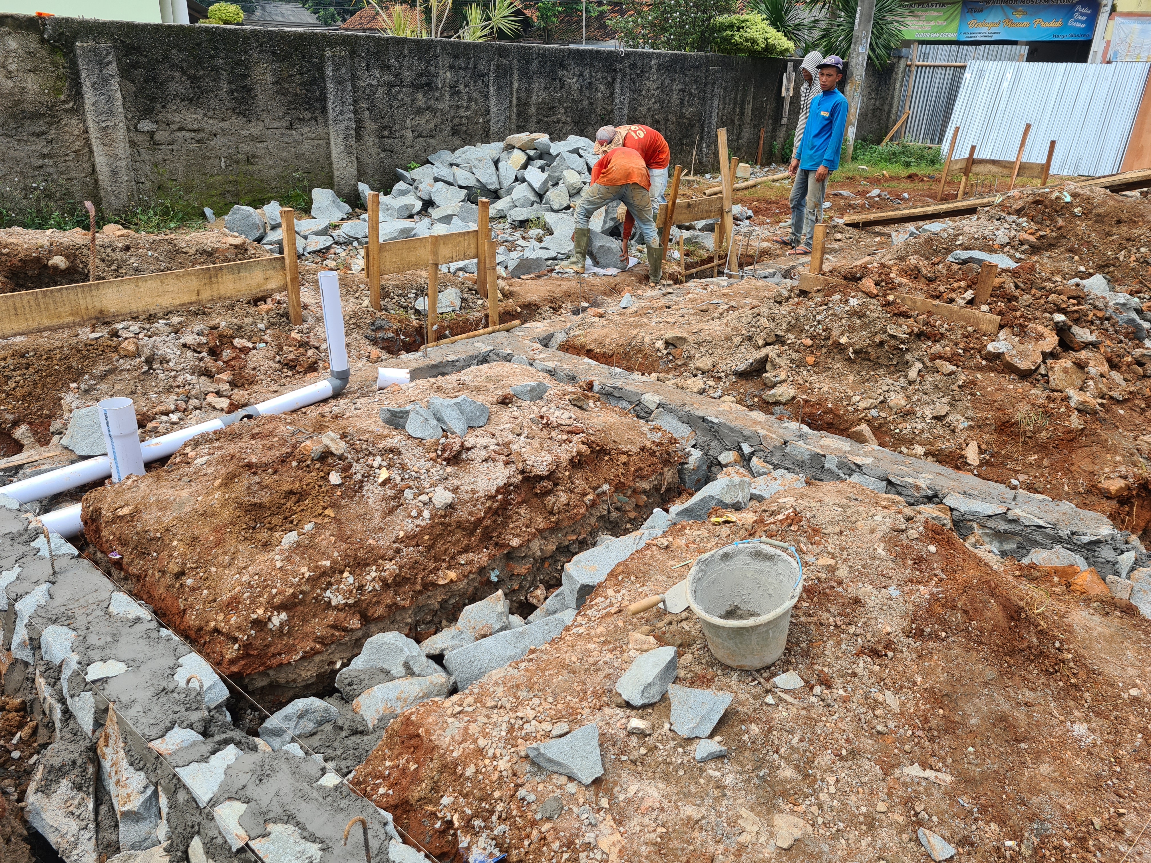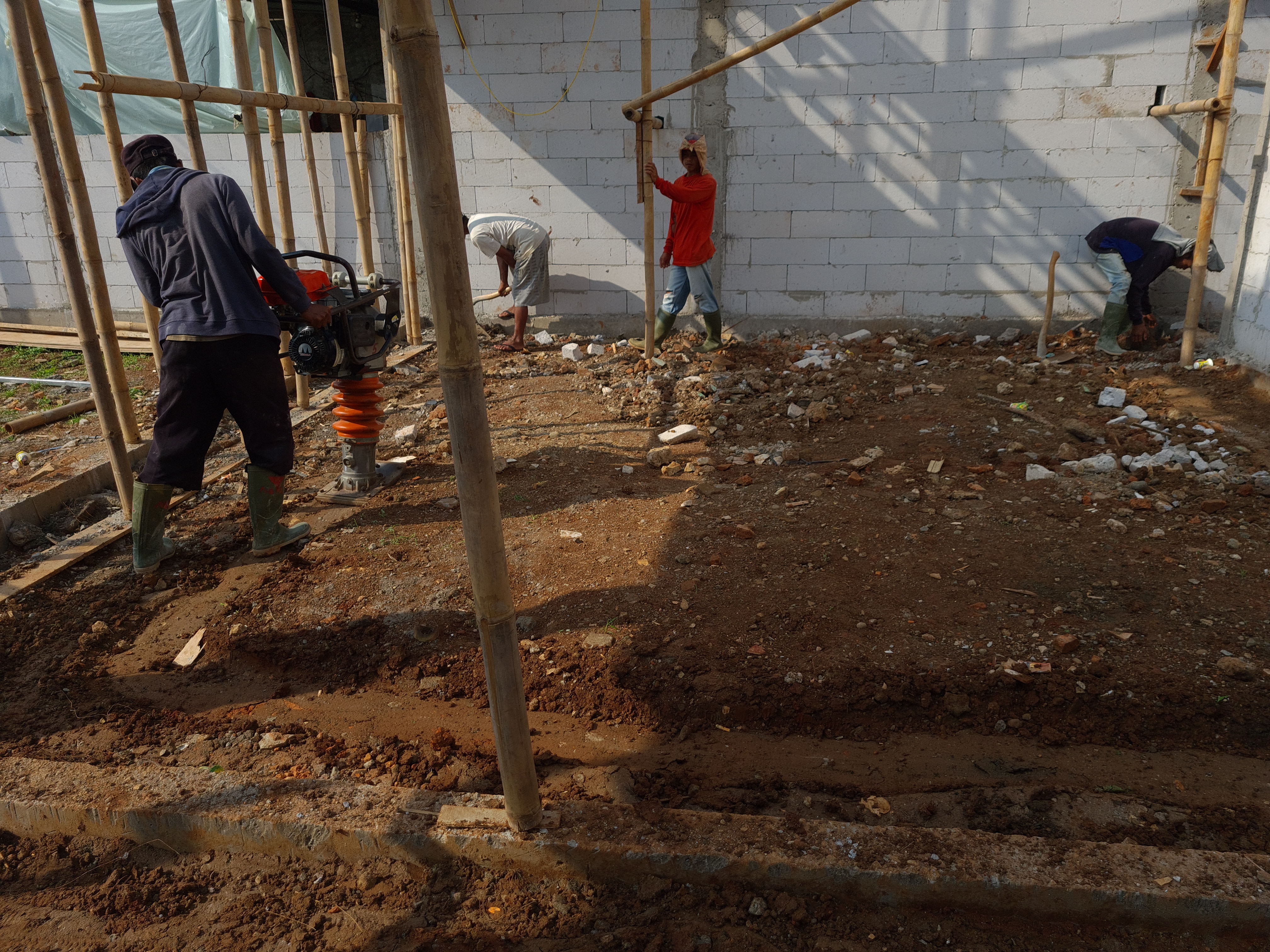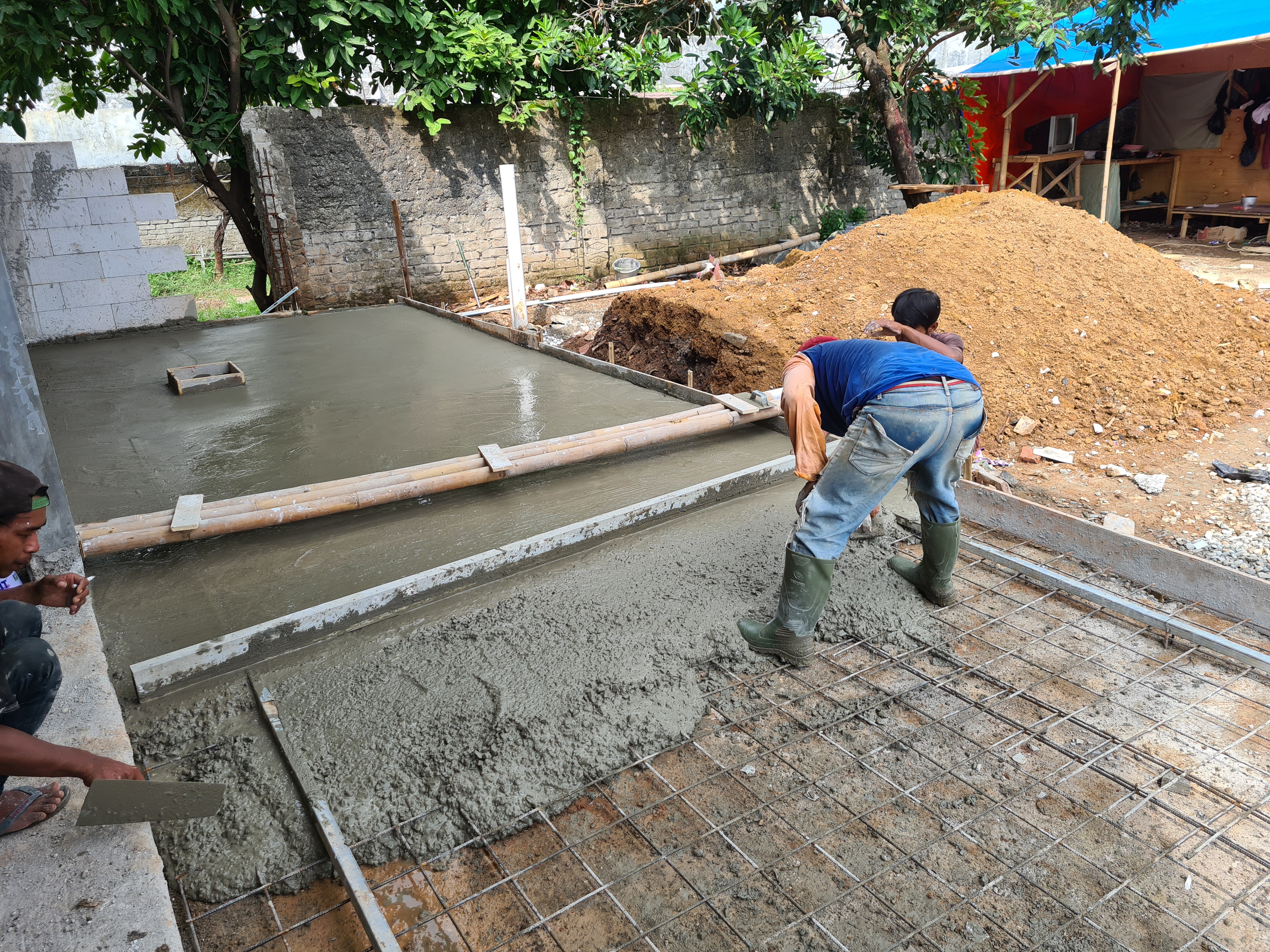 Luas total tanah 462m2, kami mendirikan bangunan 150m2. Kami pun melakukan pengecoran jalan K250 dengan wiremesh m8 seluas 220m2. Sisa tanah dibuatkan kanopi dan flooring.