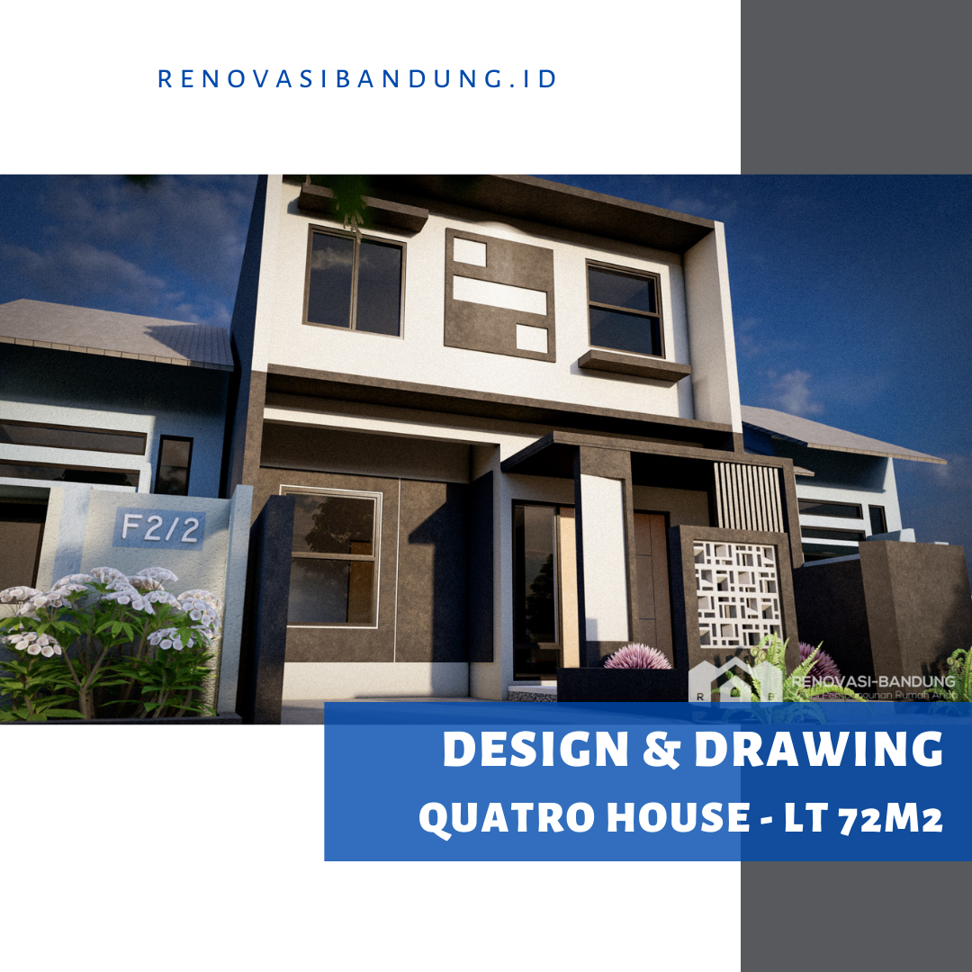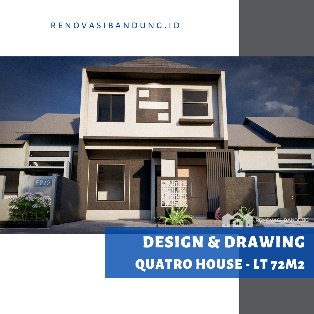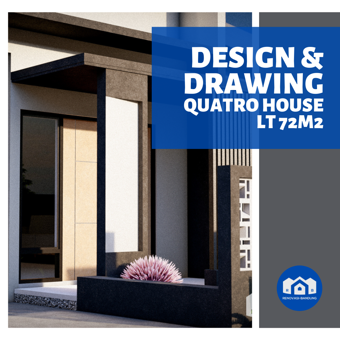 Kami beri nama Quatro House karena rumah ini memiliki 4 kamar tidur, 4 opening untuk jendela di depan, desain yang serba segi empat, dan aksen roster di depan berjumlah 4×4.