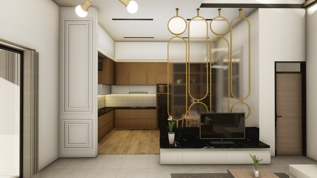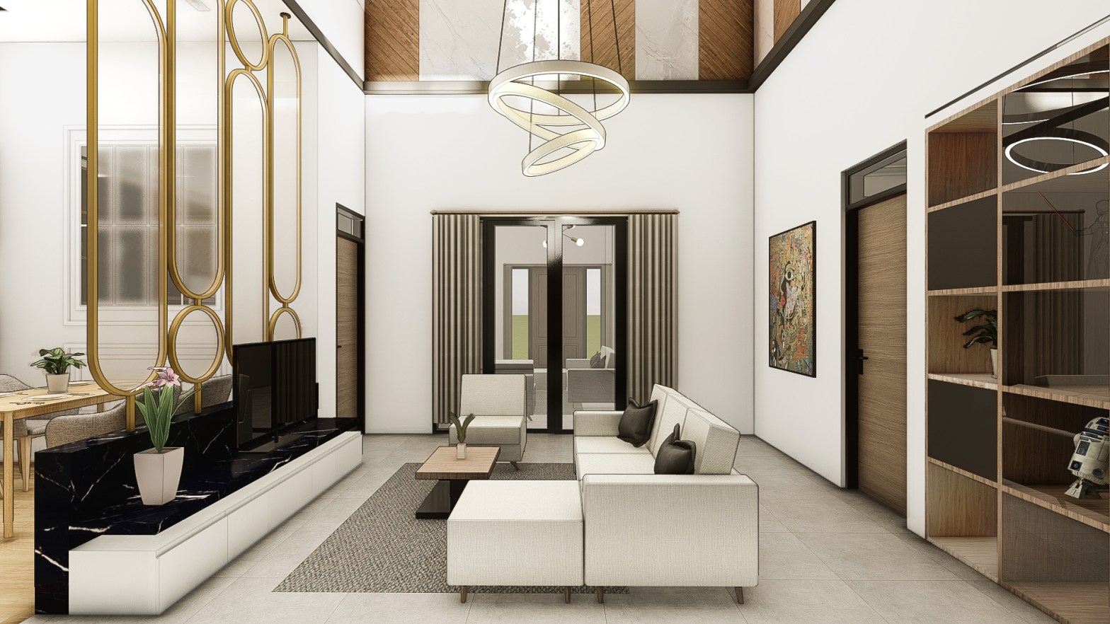 Gagasan awal klien adalah menyatukan area living, dining dan kitchen dengan konsep open plan. Terdapat kendala pada layout ruangan, dimana posisi dapur sudah fix, sehingga area living harus mengikuti layout ruangan yang ada. Solusinya adalah dengan menempatkan meja tv sebagai sekat semi-transparan sehingga kesan open plan masih terasa.