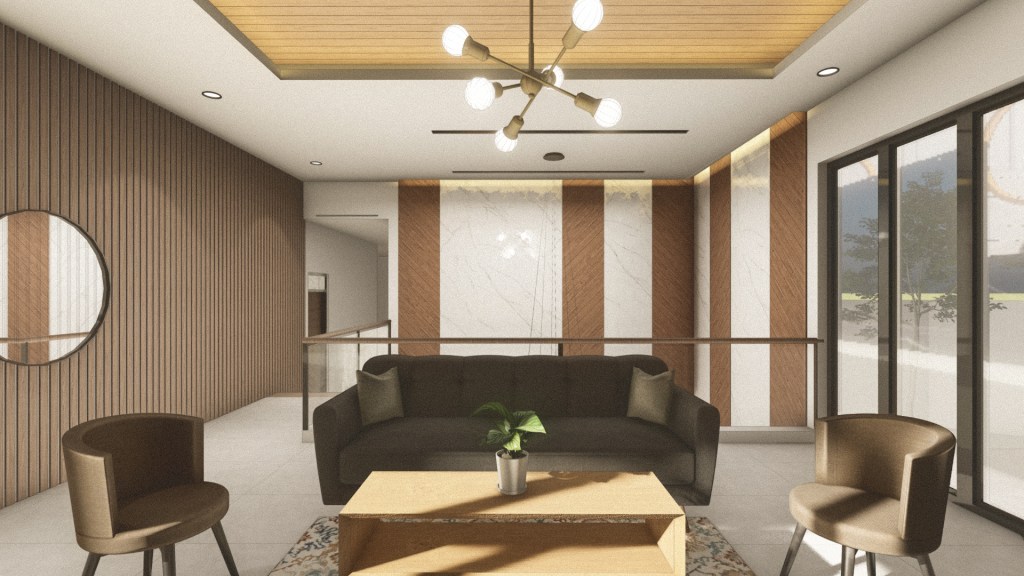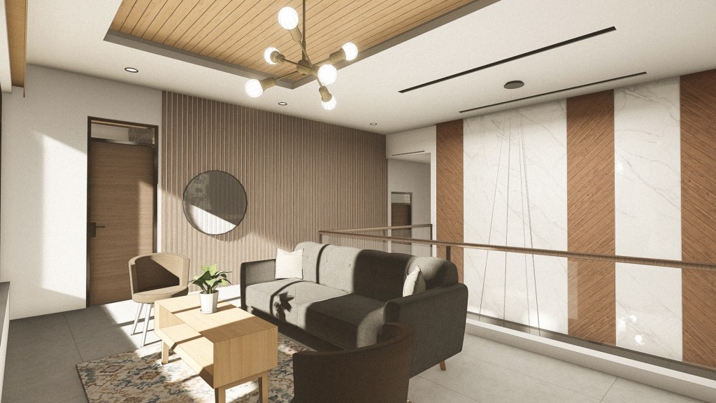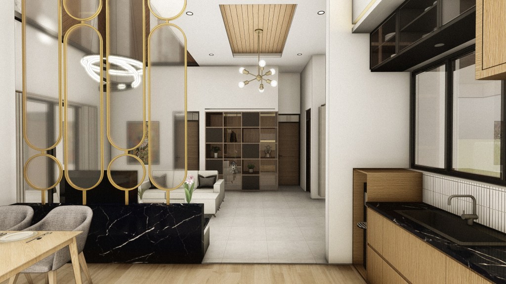 Konsep dasar interior adalah luxury – scandinavian. Kesan luxury dimunculkan dengan kombinasi material marmer dan kayu. Scandinavian dimunculkan dengan permainan texture dan warna yang didominasi oleh kayu dan cat warna cerah. Kesan scandinavian diperkuat dengan profil moulding pada dinding dan sekat kaca es yang memisahkan living & dining.