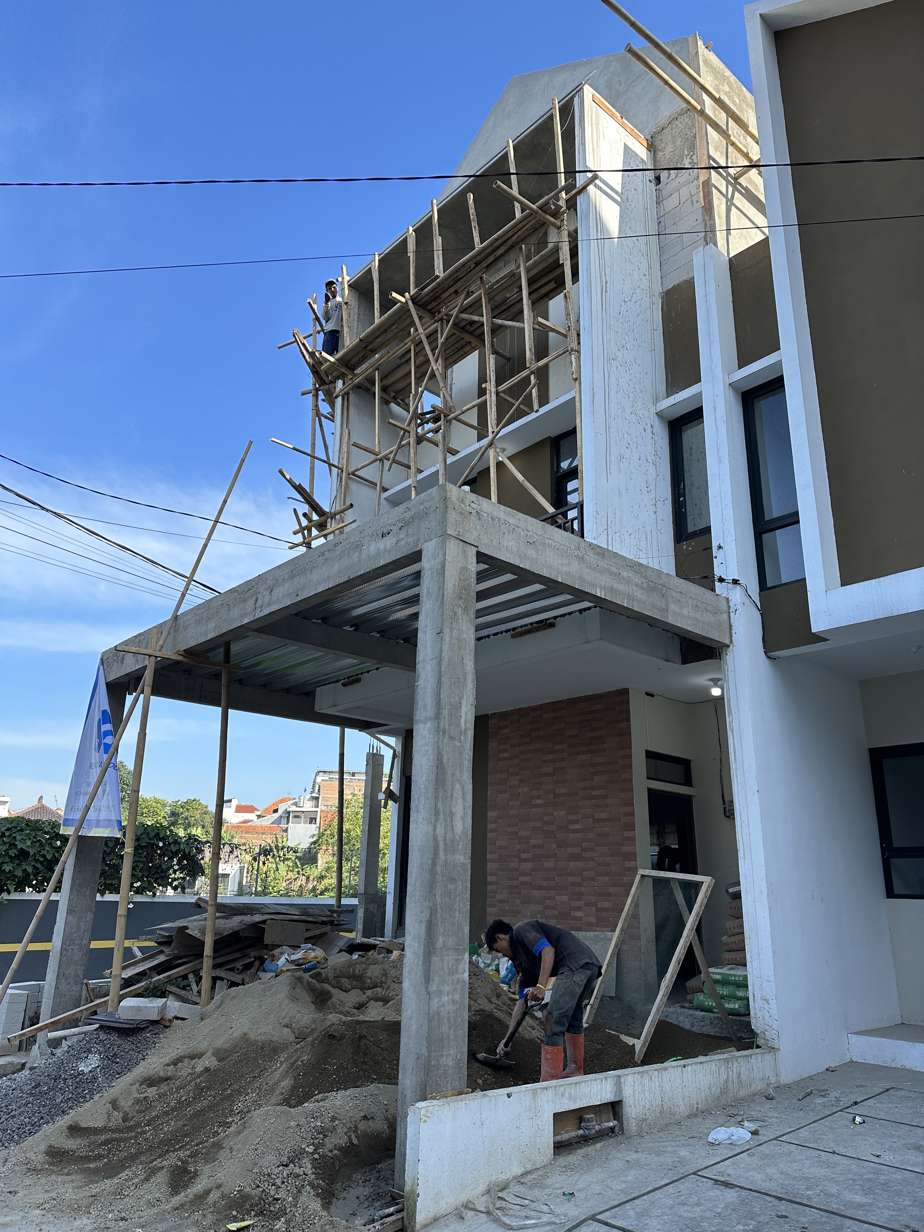 Rumah dua lantai ini diatas nya sudah di dak dan dipersiapkan untuk dibangun di lantai 3, namun area belakang nya masih belum dibangun. Tugas kita disini adalah memanfaatkan lahan kosong di belakang menjadi bangunan 3 lantai.