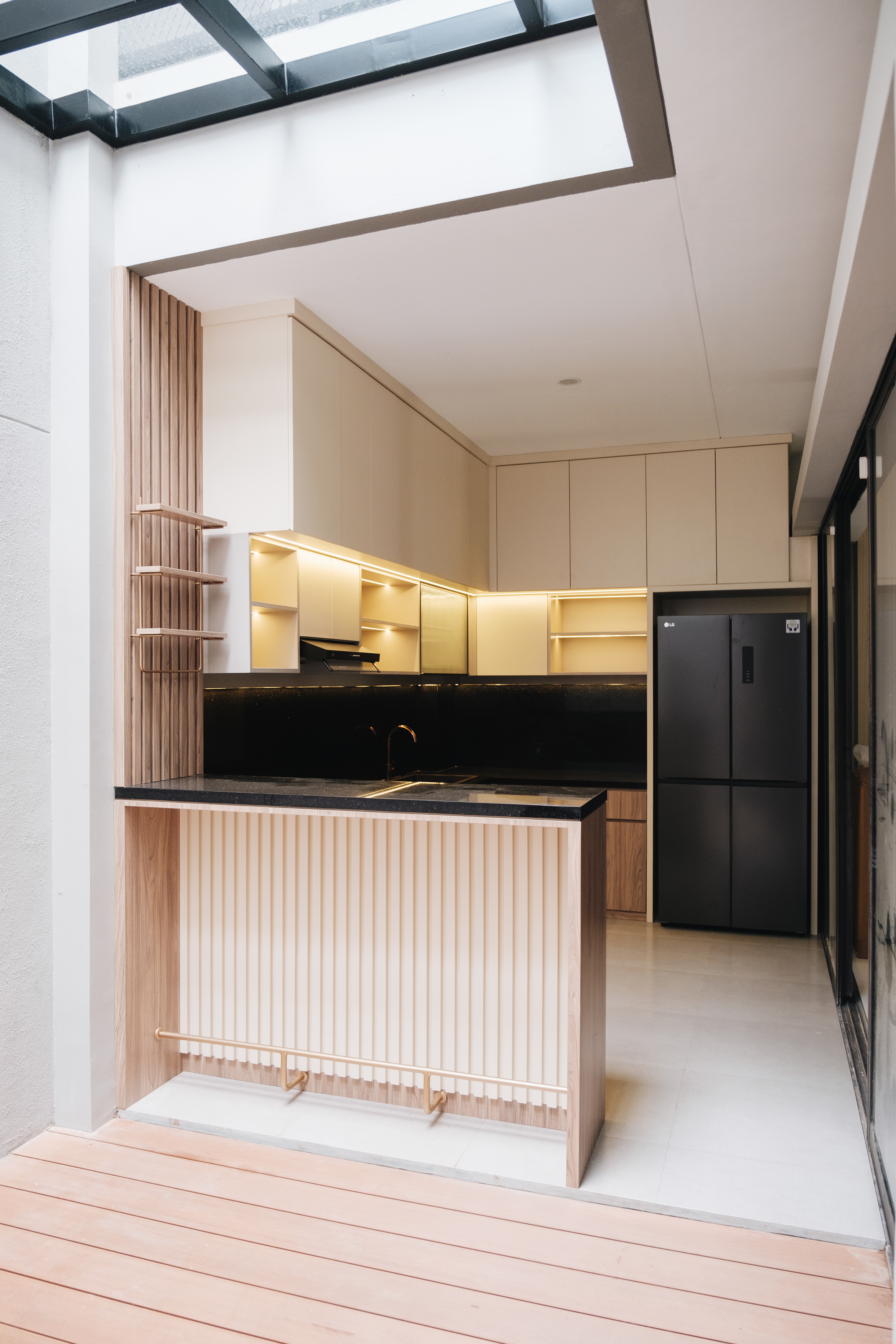 Setelah renovasi, sekarang Client memiliki Walk in Closet yang terhubung dengan kamar utama, juga area bathtub khusus dan balkon. Dapur yang semula di ruang tengah juga dipindah ke bagian belakang dengan konsep semi-open kitchen sehingga sirkulasi dan cahaya alami rumah tetap baik.