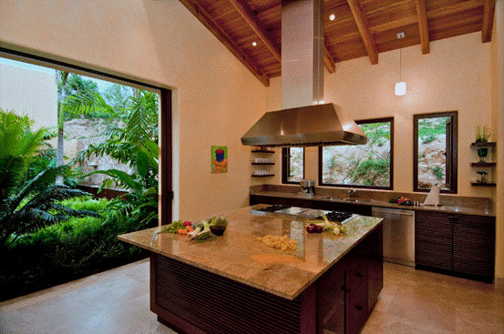 Penggunaan material alami yang kaya tekstur seperti kayu jati, batu andesit, dan aksen rotan pada furnitur. Sediakan banyak ruang untuk tanaman hias indoor. Jika memungkinkan, desain dapur terbuka yang langsung menghadap ke taman belakang akan menjadi nilai tambah yang luar biasa.