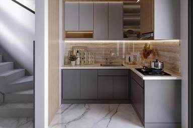 Ini adalah solusi brilian untuk hunian dengan luas terbatas, seperti di perumahan klaster atau apartemen. Desain yang simpel dan penggunaan warna terang terbukti secara visual membuat dapur terbuka minimalis terasa jauh lebih lapang.