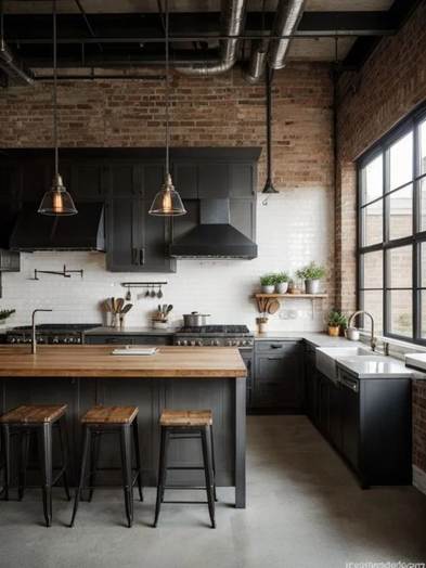 Jangan ragu untuk mengekspos material asli bangunan Anda! Dinding bata merah atau semen acian, pipa-pipa yang dibiarkan terlihat, serta penggunaan material besi hitam dan kayu solid adalah DNA dari gaya ini. Lengkapi dengan lampu gantung (pendant lamp) dari metal untuk menyempurnakan tampilan.